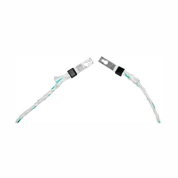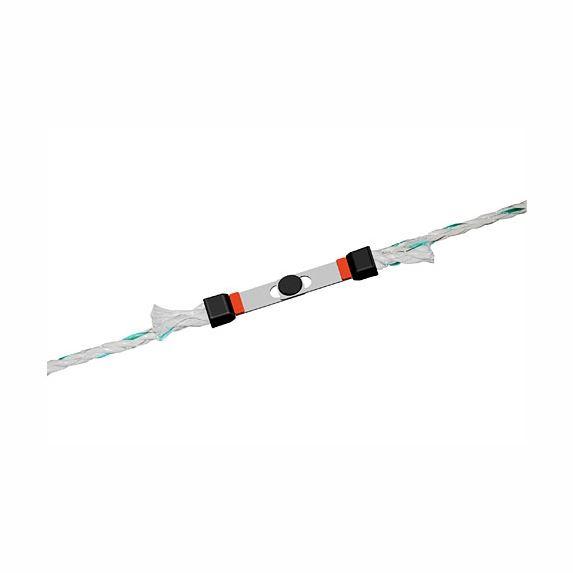 Diese neu entwickelte "SEIL-Sollbruchstelle" aus UV-stabilisiertem Kunststoff öffnet sich in Paniksituationen. Damit werden Verletzungen durch ein Verwickeln im Seil bzw. beim Durchbrechen des Zaunes reduziert. Mittels der Ersatz-Sicherheitsknöpfe können die Seilenden mit den beiden Verbindungsplatten aus hochwertigem Edelstahl wieder leicht verbunden werden.