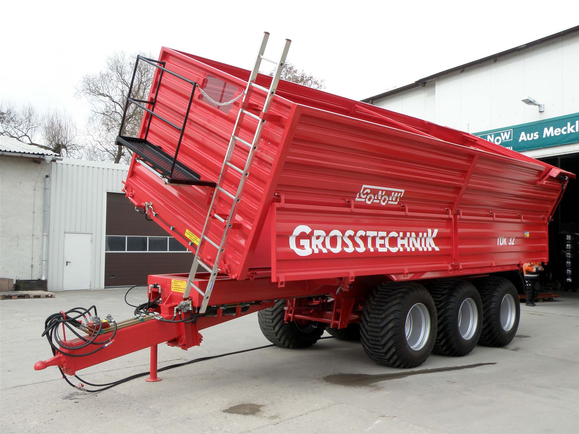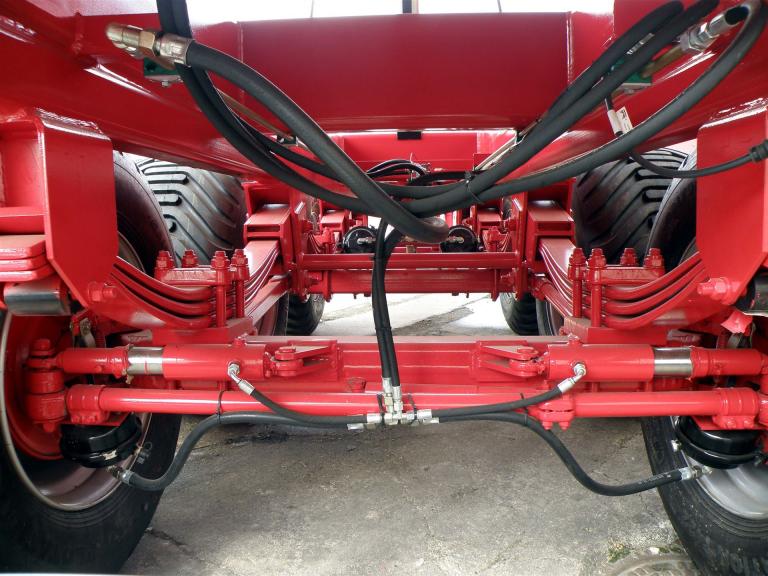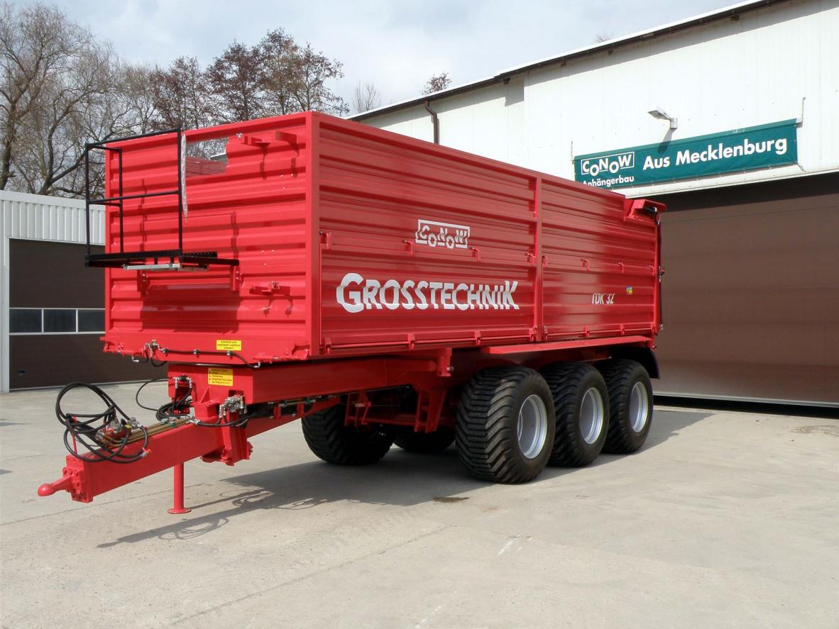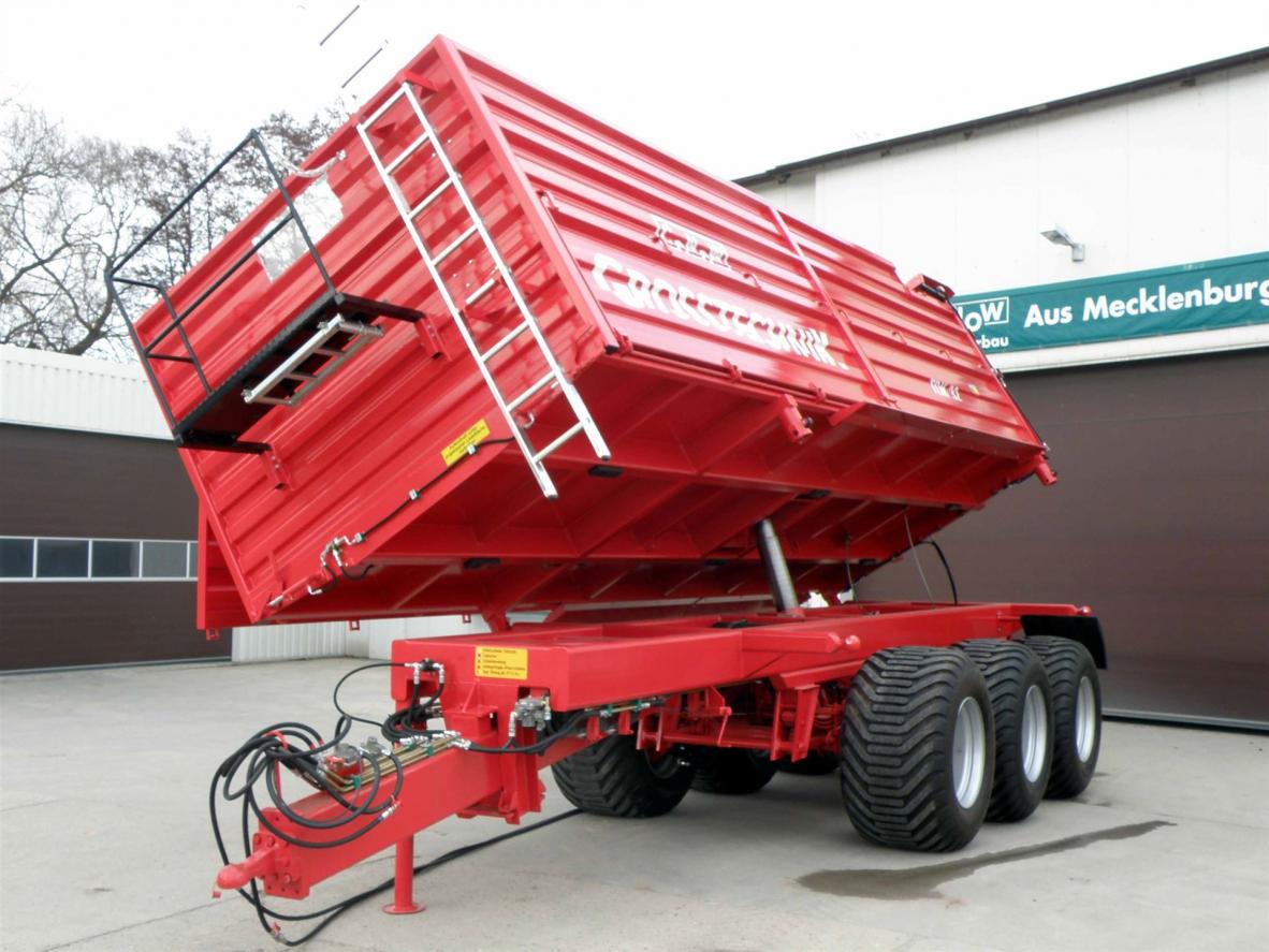 Rückwand hydraulisch ganzflächig zu öffnen (Prinzip V 9)(gegen Aufpreis Kornauslaufschieber hinten möglich)Farbgebung Aufbau: Rostschutzgrundierung und 2-Komponeten-Lack conowgrün