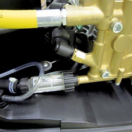 Der große, integrierte Wasserfeinfilter schützt die Hochdruckpumpe zuverlässig vor Schmutzteilchen. Der eingebaute Abgasthermostat schaltet bei einer Abgastemperatur über 300 C den Antriebsmotor ab. Das Softdämpfungssystem (SDS) kompensiert Schwingungen und Druckspitzen im Hochdrucksystem.
