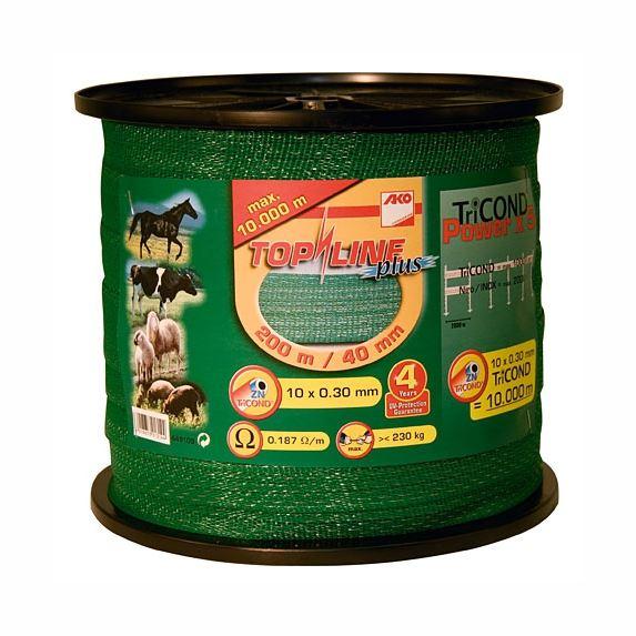 AKO TopLine PLUS garantiert hervorragende Leitfähigkeit und sehr lange Haltbarkeit bei mittleren bis langen Zaunanlagen. Im Vergleich zu nicht rostenden Drähten gleicher Stärke besitzen Bänder, Litzen und Seile der TopLine PLUS Linie, durch Verwendung unseres neuen Leitermaterials TriCOND, eine 5 x höhere Leitfähigkeit, d.h. mit TriCOND können Sie 5 x längere Zäune betreiben bzw. "transportieren" 5 x mehr Strom zum Ort der Tierberührung = 5 x mehr Sicherheit